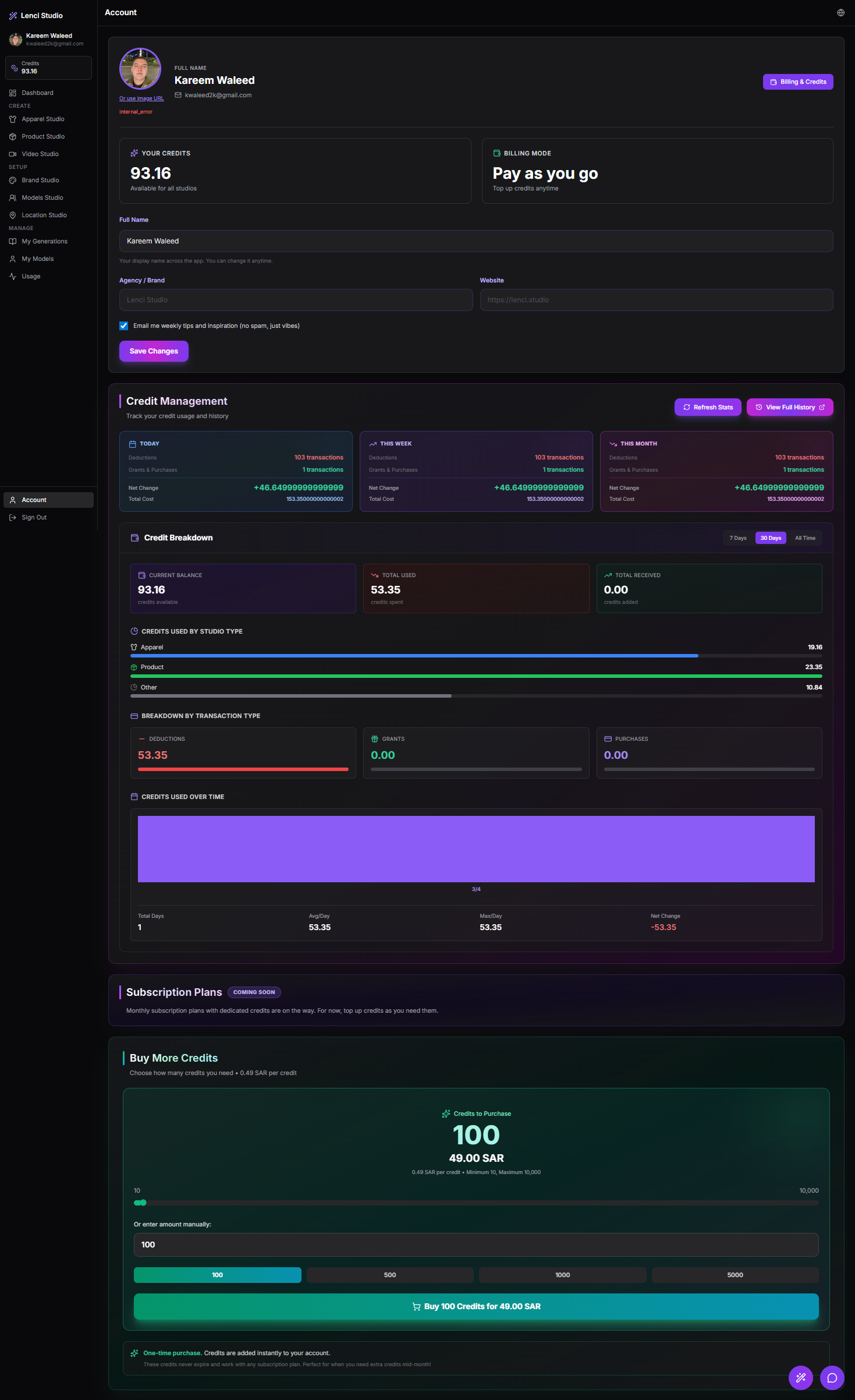 1) Avatar when user upload an avatar it says internal error while when user refresh the avatar is there added 2) Credit Management Track your credit usage and history Refresh Stats View Full History Today Deductions 103 transactions Grants & Purchases 1 transactions Net Change +46.64999999999999 Total Cost 153.35000000000002 This Week Deductions 103 transactions Grants & Purchases 1 transactions Net Change +46.64999999999999 Total Cost 153.35000000000002 Still the decimal numbers are showing more than 2 decimals 3) Credits used by studio type only apparel and product rest studios are named others this is issue it should be named with all 6 studios we have 4) Still when adding an agency name in the account and refresh it goes even while it said sucessfully saved .