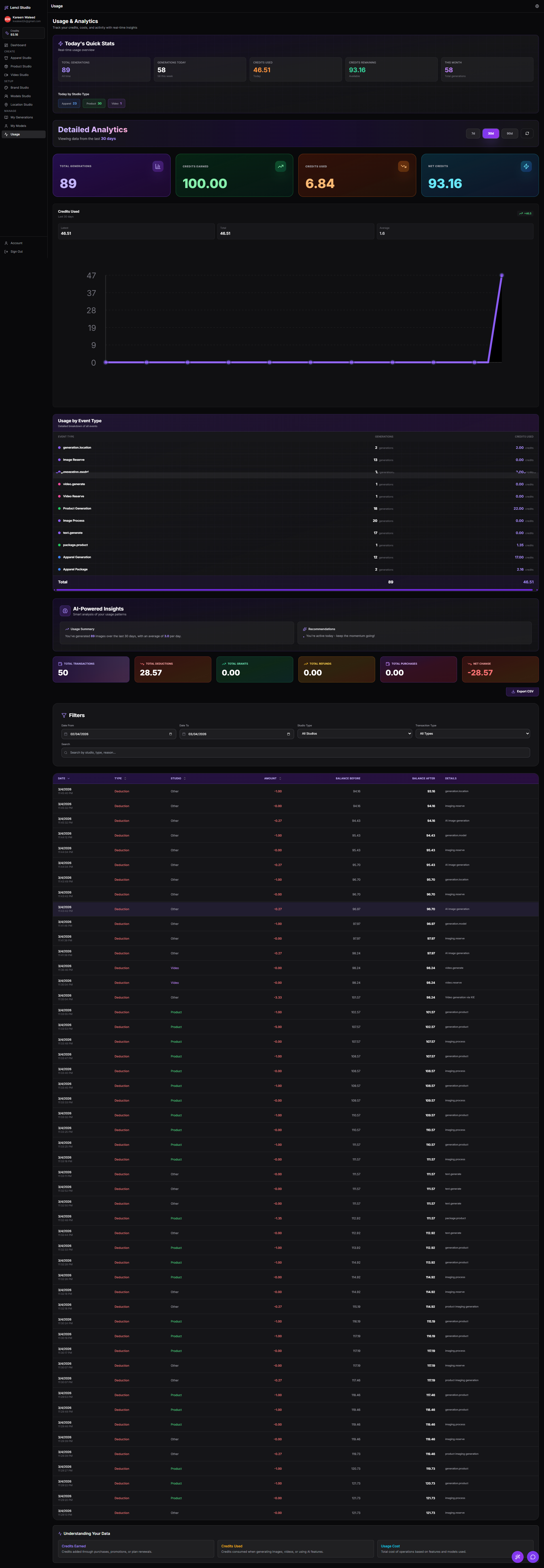 the usage is still so confusing to the user as it shows 89 generations which including text generations, image processing, the user doesnt need to see all this info and also generations on any other studio than apprel, product or video shows other which doesnt make since i see if user sees only the 6 studios with the generation of the images cost only