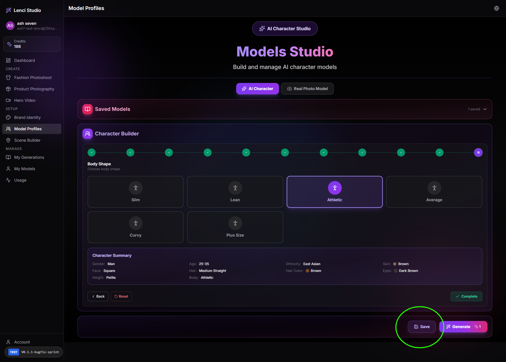 Issue Description In Models Studio → Character Builder, the Save button is enabled even when the user has not generated a model yet (no generated output to persist). This allows users to attempt saving an incomplete/invalid model state, which can cause confusion (“what did I save?”) and increases the chance of empty/placeholder records being created. Expected Behavior Save should be disabled by default while the model has not been generated. Save becomes enabled only after a successful generation exists (i.e., there is a generated model output/preview tied to the current configuration). If generation fails or is cleared/reset, Save returns to disabled. Acceptance Criteria On initial entry to Models Studio (no generation performed), Save is disabled (visually + functionally). Clicking Save while disabled is impossible (no action, no API call). After the user clicks Generate and generation succeeds (generated model output exists), Save becomes enabled. If the user clicks Reset, changes the character parameters in a way that invalidates the last generated result, or removes the generated output, Save becomes disabled again until a new successful generation occurs. Save always persists the latest successfully generated model (not just the form selections).