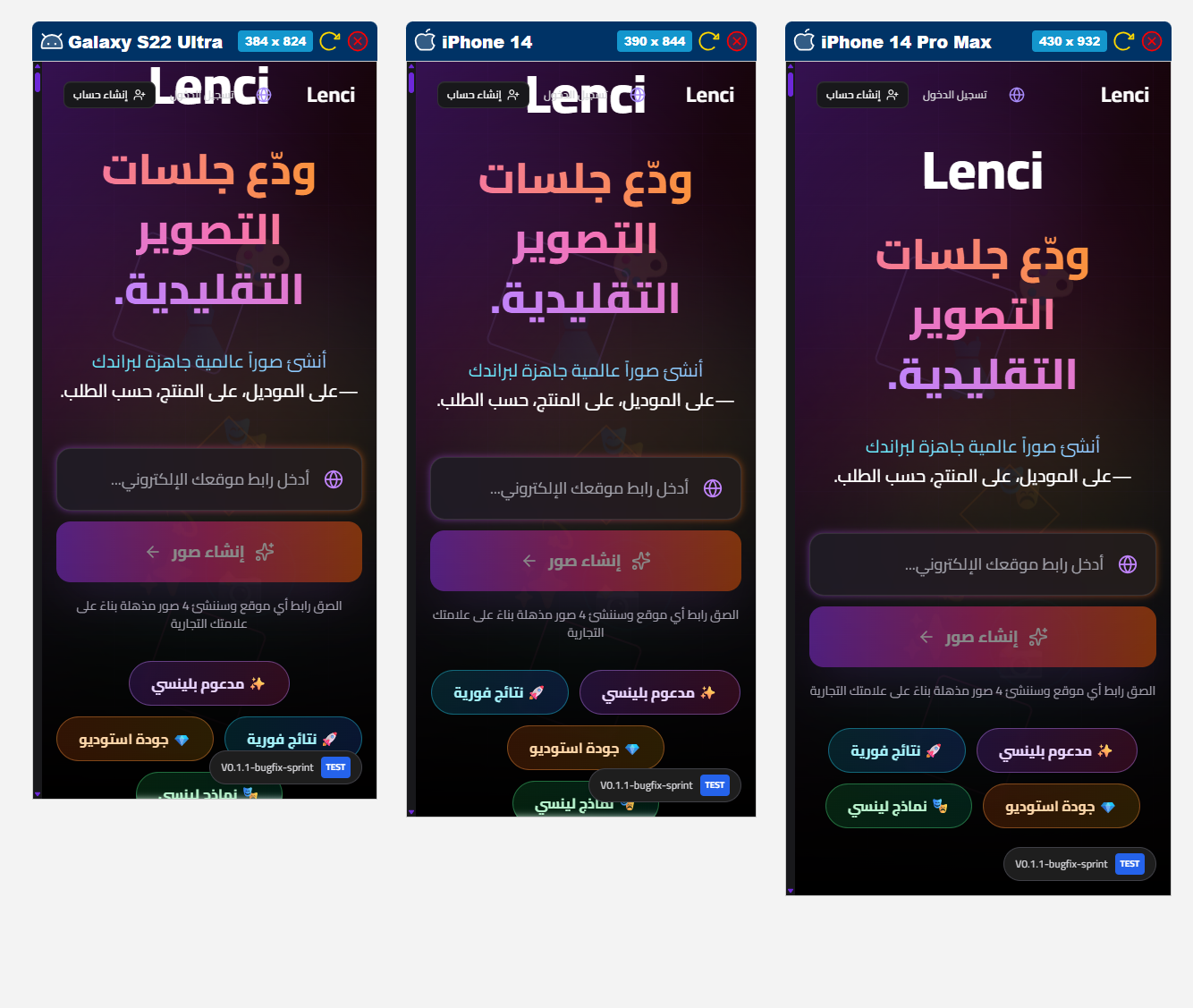 Issue Description On some mobile viewports, the Lenci logo overlaps/interacts with the transparent header (top navigation area). The header content (logo + actions like “إنشاء حساب/تسجيل الدخول” and icons) appears to collide with the hero/brand area, causing visual overlap, clipping, or stacking conflicts. This is inconsistent across devices (e.g., Galaxy S22 Ultra vs iPhone 14/14 Pro Max), which suggests responsive breakpoints/safe-area/header height rules aren’t stable. Expected Behavior The header area (logo + actions) should remain self-contained with predictable height and spacing. The hero content (logo/heading) should start below the header and never overlap with it. On all mobile sizes, the logo and header elements should be fully visible and not clipped, including devices with notches/safe areas. Acceptance Criteria On the listed mobile sizes (Galaxy S22 Ultra 384×824, iPhone 14 390×844, iPhone 14 Pro Max 430×932), the header and hero content do not overlap. The header maintains a consistent minimum height and the page content below has enough top padding/margin to clear it. The logo in the header is fully visible (no clipping), and the header actions/icons remain clickable with no element covering them. Scrolling does not cause the header to “jump” into the hero area or change stacking order unexpectedly. Works correctly with RTL (Arabic) and respects safe-area insets (notch) without elements touching/colliding with the screen edges.