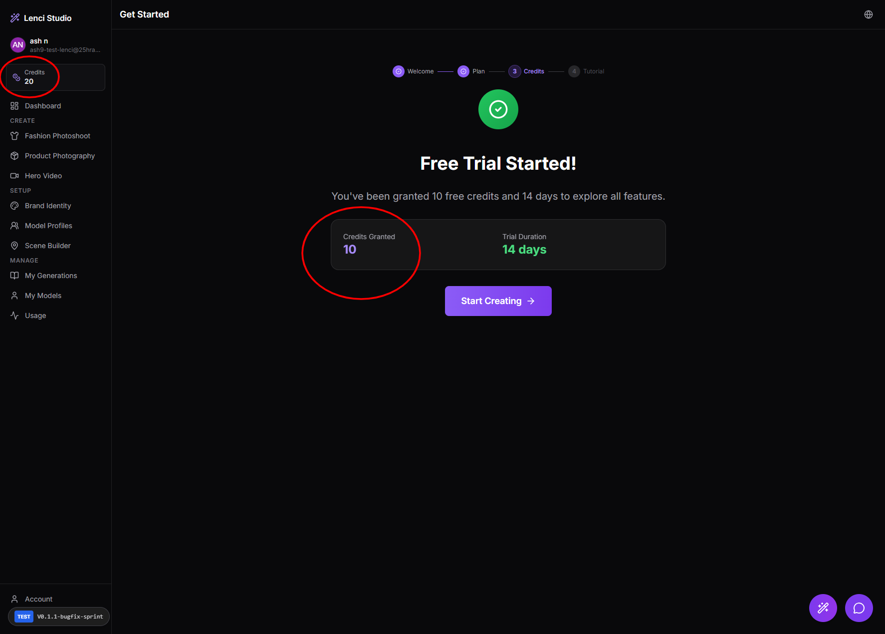 Issue description In the onboarding flow, the UI shows “10 credits granted / 10 credits have been added” on the onboarding steps, while the sidebar credit balance shows 20 for the same user/session. This mismatch appears across two consecutive onboarding steps/pages, creating confusion about the actual trial credit balance and whether credits were granted twice or the UI is out of sync. Expected behavior The onboarding “credits granted” message and the sidebar balance should always match the user’s actual credit ledger/balance. If the trial grants 20 credits, every onboarding step that references granted credits must say 20 (or use a dynamic value). If the sidebar shows the current balance (e.g., includes existing credits), onboarding copy should clearly distinguish “Granted now” vs “Current balance”—but the numbers must still be accurate based on the same source of truth. Acceptance criteria AC1 — Single source of truth: The value shown in onboarding (“credits granted/added”) is pulled from the same authoritative source as the sidebar balance (or from a clearly-defined “trial grant amount” field) and is consistent. AC2 — Correct value displayed: For a new account that receives 20 trial credits, onboarding screens display 20 (not 10) anywhere credits are referenced. AC3 — Consistency across steps: Navigating through the onboarding steps (including refresh/back/forward) never shows conflicting credit values between onboarding messaging and the sidebar. AC4 — No hardcoded copy: There is no hardcoded “10 credits” string in onboarding UI; credit numbers render dynamically based on the actual configured grant/balance. AC5 — Edge cases: If the user already had credits before onboarding (e.g., admin grant), the onboarding message either: shows the actual trial grant amount, and labels it clearly (“Trial credits granted: X”), or is hidden/skipped when not applicable—without showing incorrect numbers.