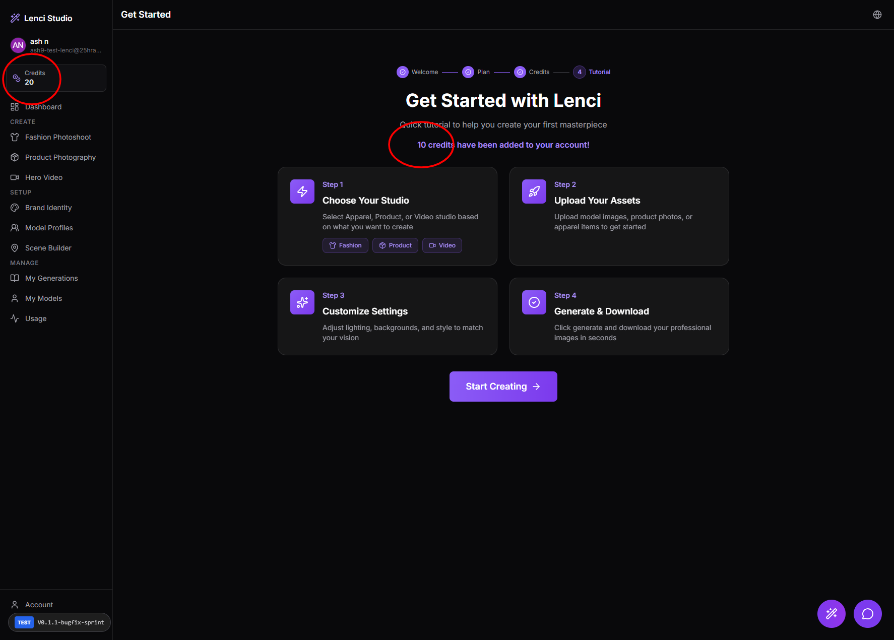 creditHistoryService-Qs2rnbBE.js:1 📊 [AuthContext] Final user profile: {id: 'b449d8e3-ff56-408d-a129-e68678fb9936', email: 'ash9-test-lenci@25hraf.com', plan: 'starter', generationsUsed: 0, creditsBalance: 10}