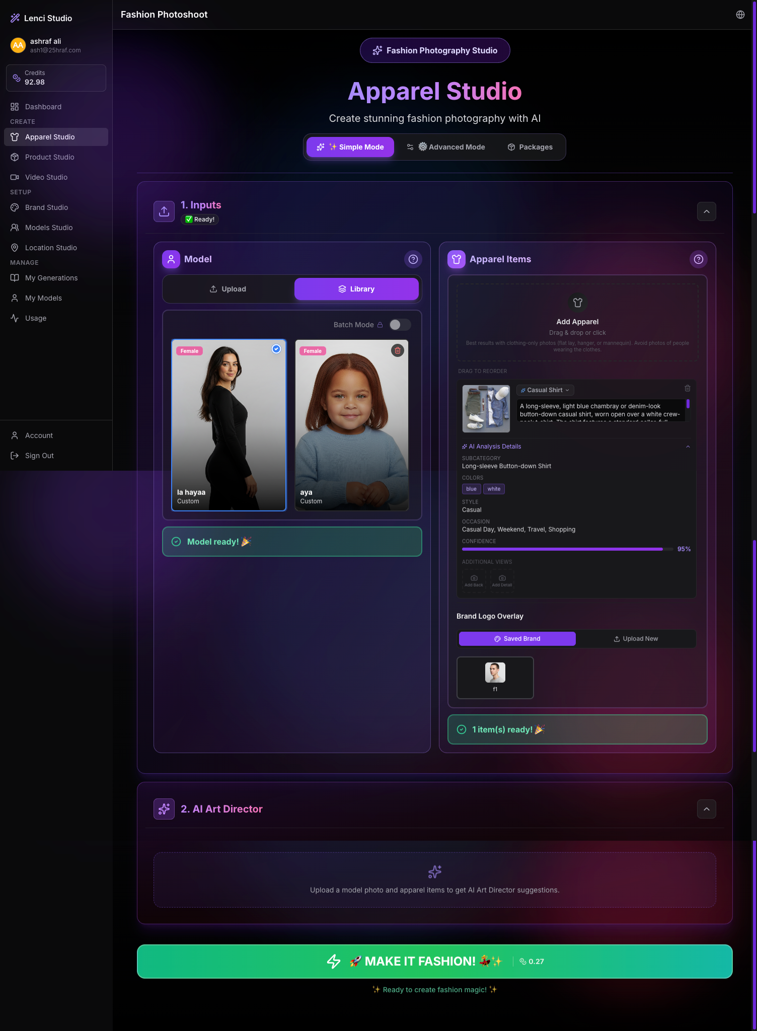 Issue description In Apparel Studio, after generating an image and then refreshing the page, the previously selected model and uploaded apparel item remain preloaded in the Inputs section. Because the studio workflow is designed to start with a fresh session for each generation, retaining previous inputs after a page refresh disrupts the expected flow. Users may unintentionally generate new images using the previous model and apparel, which can lead to incorrect outputs and confusion. This behavior also creates state inconsistency between sessions and may cause users to believe the system is starting a new workflow while it is actually reusing previous inputs. Expected behavior Refreshing the page should reset the studio state and clear all temporary session inputs. When the user reloads the page: • The Model selection should return to the empty state. • The Apparel Items section should be cleared. • The workflow should start as a new generation session. Previously used assets should only remain accessible through Library, My Models, or My Generations, not as preselected inputs. Acceptance criteria • Refreshing the Apparel Studio page clears: • Selected model • Uploaded apparel items • AI analysis data associated with those items • The Inputs section returns to the default empty state. • The “Ready” indicators reset accordingly. • The user must explicitly select a model and upload apparel again before generating. • Previously uploaded assets remain available only through library selection, not automatically preloaded. • Each generation session starts with a clean workflow state after refresh.